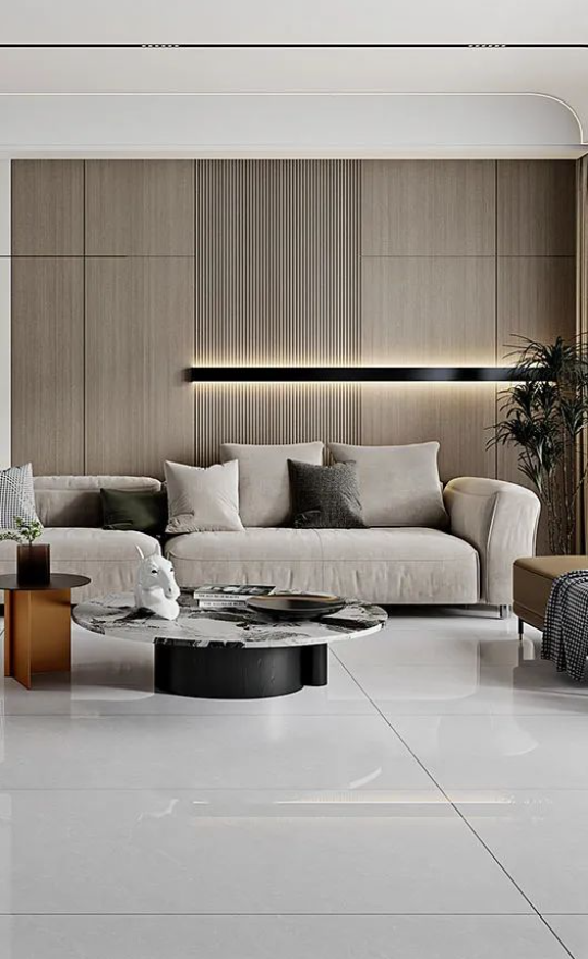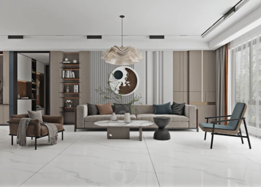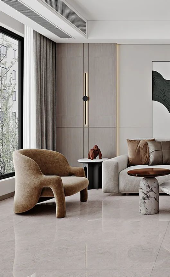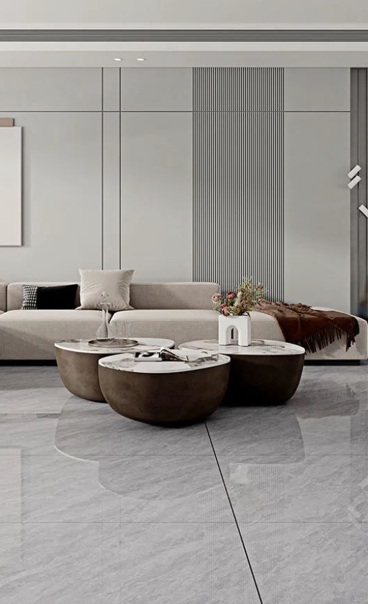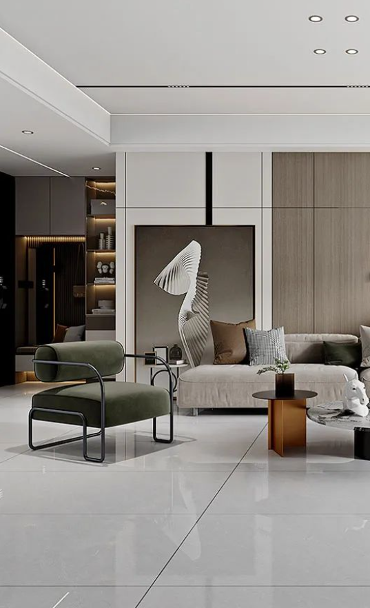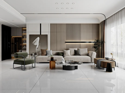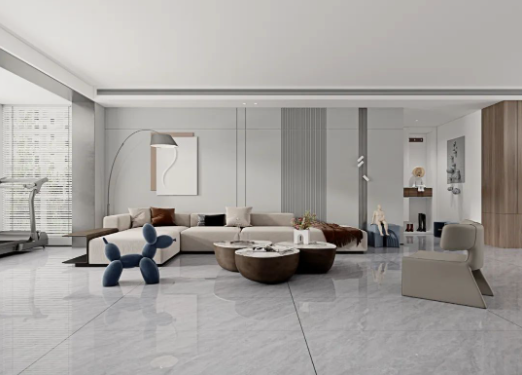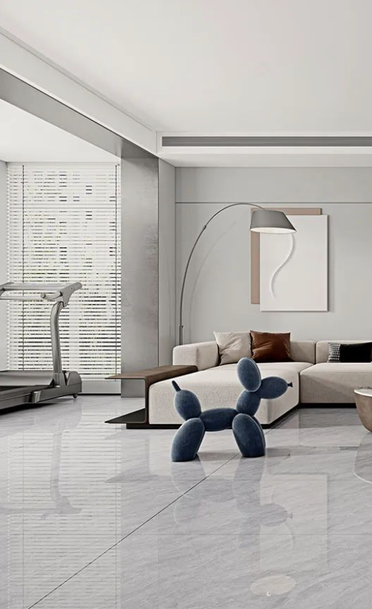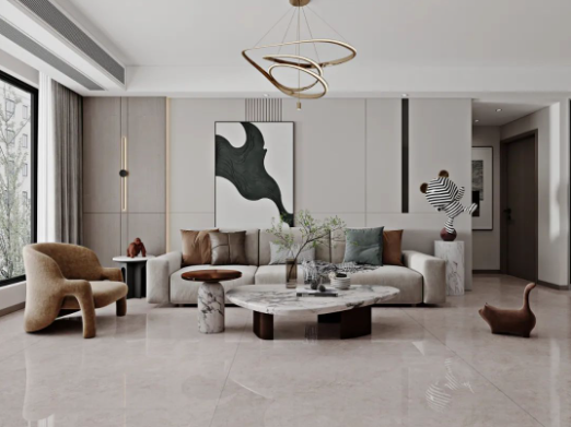 客廳采用無(wú)限連紋哈爾施灰作為地面通鋪