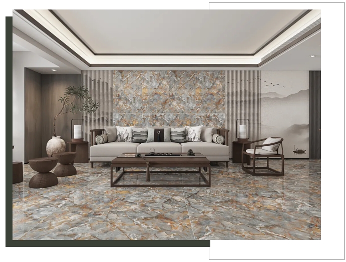 【瑪吉特】整體大面積上墻鋪地,打造出大氣磅礴的視覺張力,搭配新中式風格的家居軟裝,將高級與優雅平衡融入,盡顯居者不俗的審美品味。