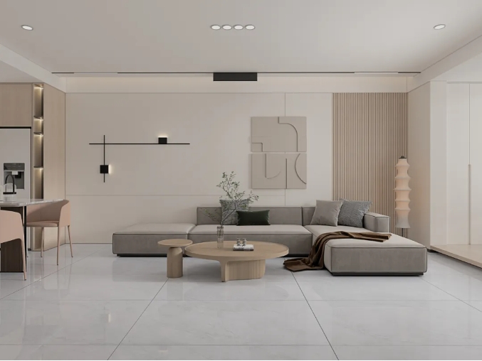 極簡的素色客廳中,冰瑩玉瓷磚如凝霜鋪地,清冽的紋理與大地色軟裝相映,綠植點綴間,冷調空間盡顯溫馨與自然。